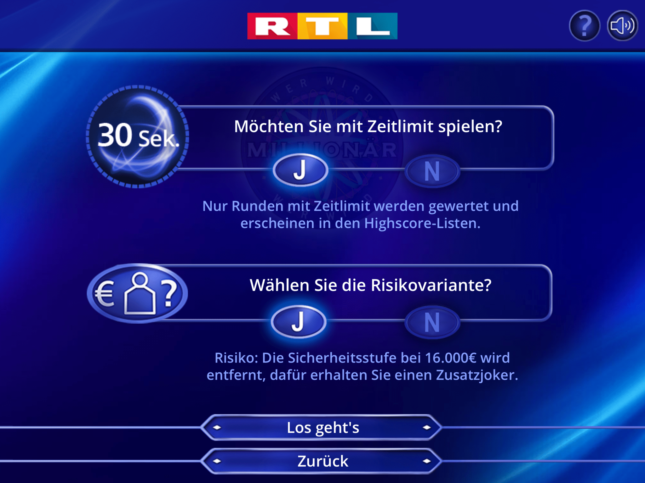 Das Regelwerk orientiert sich am TV Format. Beantworte 15 Fragen richtig und gewinne die virtuelle Million. Du hast vorab die Möglichkeit, Einstellungen vorzunehmen. Hierzu gehört die Option, ein Zeitlimit einzustellen. Um das Spiel für die Highscore-Liste zu qualifizieren, muss diese Funktion aktiviert sein. Pro Frage hast du in diesem Fall 30 Sekunden Zeit, um die richtige Antwort auszuwählen. Die zweite Option für den Anfang ist die Wahl, ob die Risikovariante gespielt werden soll oder nicht. Wird sie ausgewählt, so verschwindet die Sicherheitsstufe 16.000 € und ein Zusatzjoker wird freigeschaltet. Jetzt musst du nur noch die Auswahl mithilfe des Feldes „Los gehts“ bestätigen.