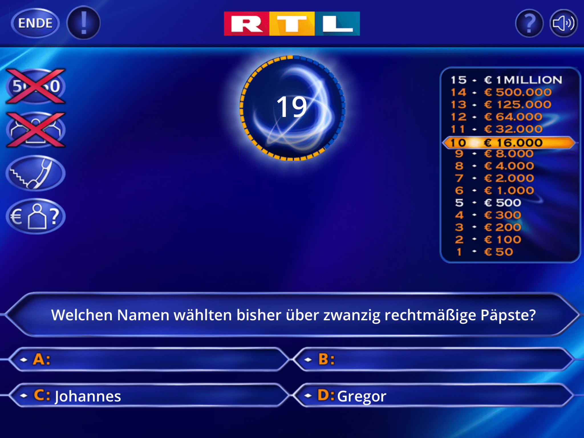Direkt nach der Werbung wird die Auswahlfrage gespielt. Hierfür müssen die vier Antwortfelder nacheinander in der richtigen Reihenfolge angetippt werden. Danach startet das Klettern auf der Millionentafel. Du musst jeweils die richtige Antwort auswählen, um die nächste Frage spielen zu können. Weißt du mal nicht weiter, so kannst du einen der Joker einsetzen. Folgende stehen zur Auswahl:
